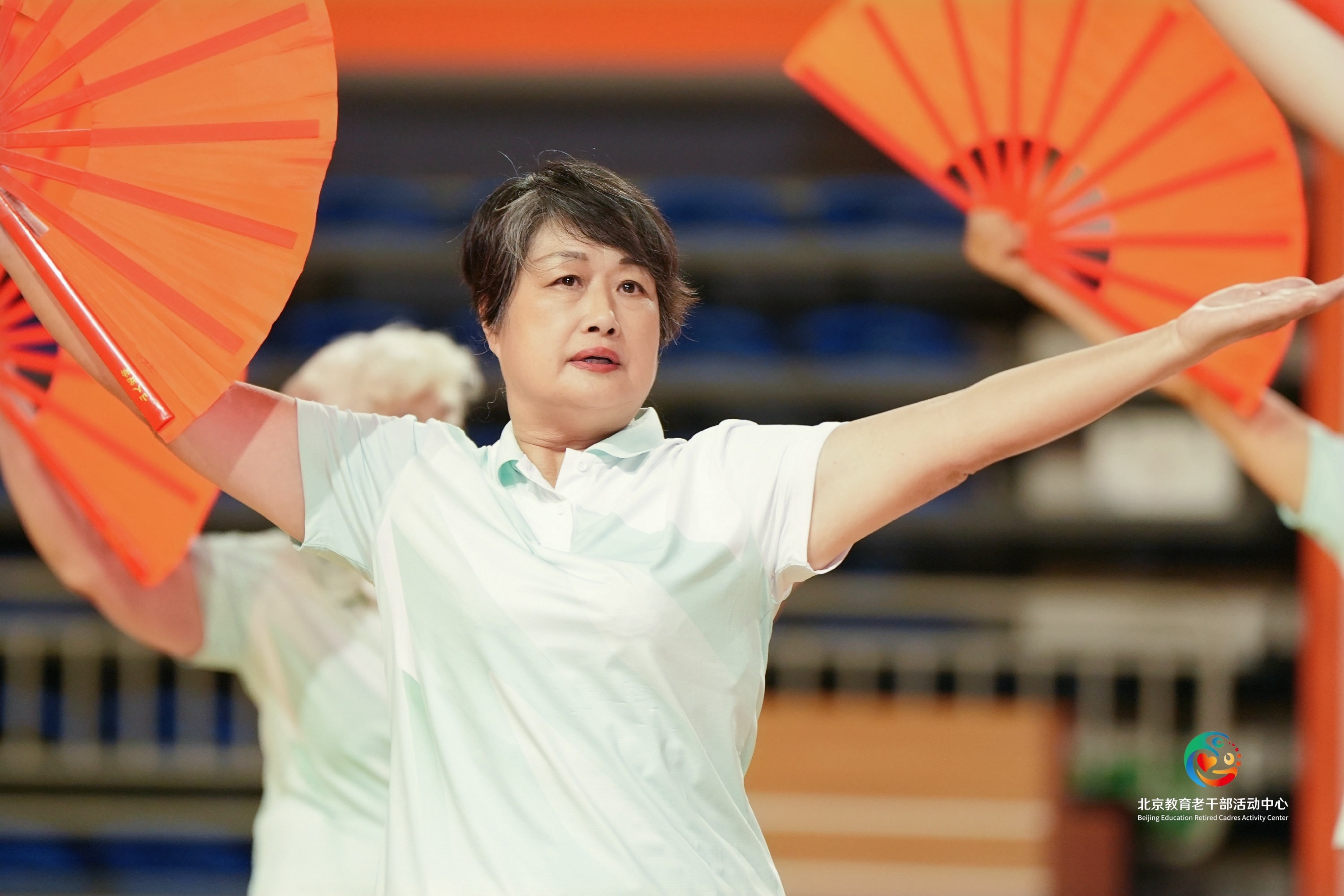 表演中,老师们将传统太极与现代歌曲相融合,在《万疆》大气磅礴的旋律中,老师们动作整齐划一、舒缓沉稳,扇面轻摇,开合间透着传统韵味,高潮处,老师们发力迅猛,扇面开合“唰唰”作响,一招一式刚柔并济,将太极文化的独特魅力展现地淋漓尽致。得到组委会评委及全场观众的肯定,充分地展现了新时期北京高校老同志阳光健身心,幸福好生活的精神面貌,并获得“阳光风采奖”。